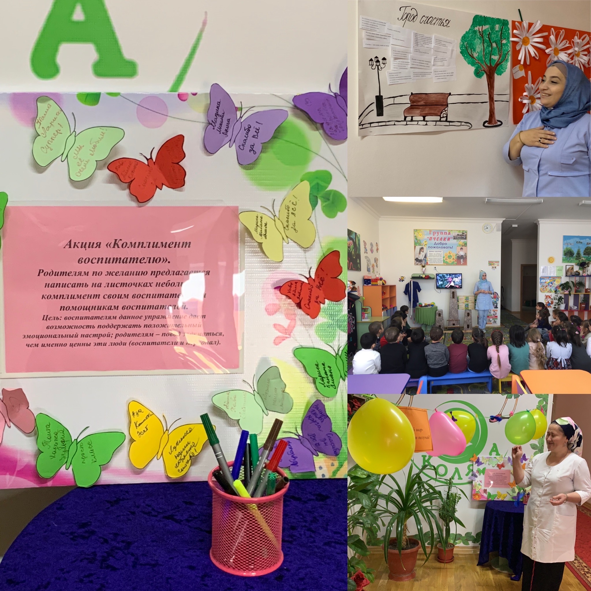 С 25 ноября по 29 ноября у нас в ДОУ прошёл интересный и увлекательный марафон «Неделя психологии», который провела наш Педагог-психолог Бачарова А.В. Весь коллектив детского сада был вовлечён в этот марафон. Неделя включала в себя несколько разнообразных по содержанию мероприятий, каждое из которых позволяло создать атмосферу доверия,сотрудничества,единения. В первый день недели была проведена акция «Комплимент воспитателю»- в холле детского сада был вывешан плакат,где родители могли написать приятные слова воспитателям и помощникам. Второй день открыла акция «Наше настроение» был заранее подготовлен красочный плакат, на котором каждый желающий мог нарисовать своё настроение. Так же в течение дня была организована выставка «Город счастья». Третий день недели был назван- «Днём дружбы». В старшей группе «А»проведена беседа на тему: «Что такое дружба?»,была организована фотовыставка «Мои друзья». Четвёртый день был открыт акцией «Волшебные шары». В холле были развешаны яркие шары с сюрпризом. Все желающие могли лопать шары и прочитать приятные слова, которые поднимали настроение. В этот же день был проведён тренинг с педагогами «День психологической разгрузки»направленный на формирование благоприятного психологического климата, сплочение коллектива, создание доверительных отношений. В последний день «Недели психологии» подведены результаты,обсуждение мнений и пожеланий.