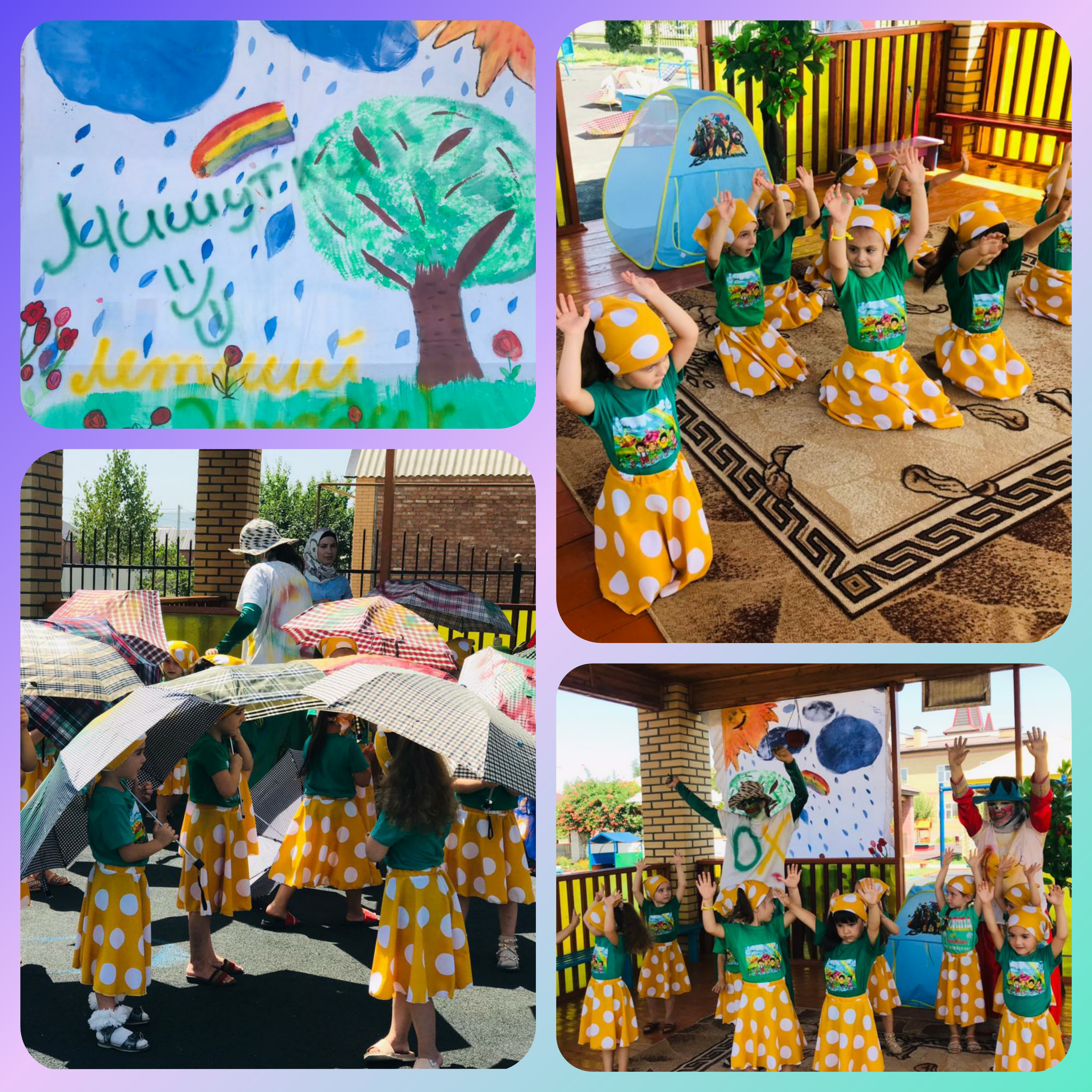 Тема: ,, Праздник летних дождей" Цель: Создать веселое жизнерадостное настроение. Задачи: Познакомить детей с такими явлениями как дождь, гроза, молния и радуга.