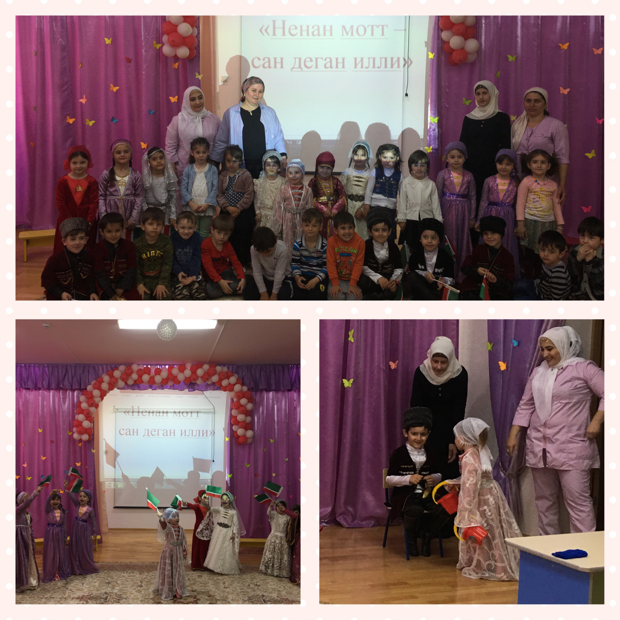 В целях реализации годового плана работы ДОУ по духовно-нравственному воспитанию дошкольников проведены мероприятия, посвященные Дню Чеченского языка.В средних и старших группах проведены тематические беседы, посвященные "Неделе чеченского языка" с целью углубления знаний о родном языке, воспитания любви к родному краю. Так же проведен утренник: "Ненан мотт- сан деган илли". Дети с удовольствием прочитали стихи и спели песни на родном языке.В завершении утренника дети станцевали зажигательную лезгинку!
