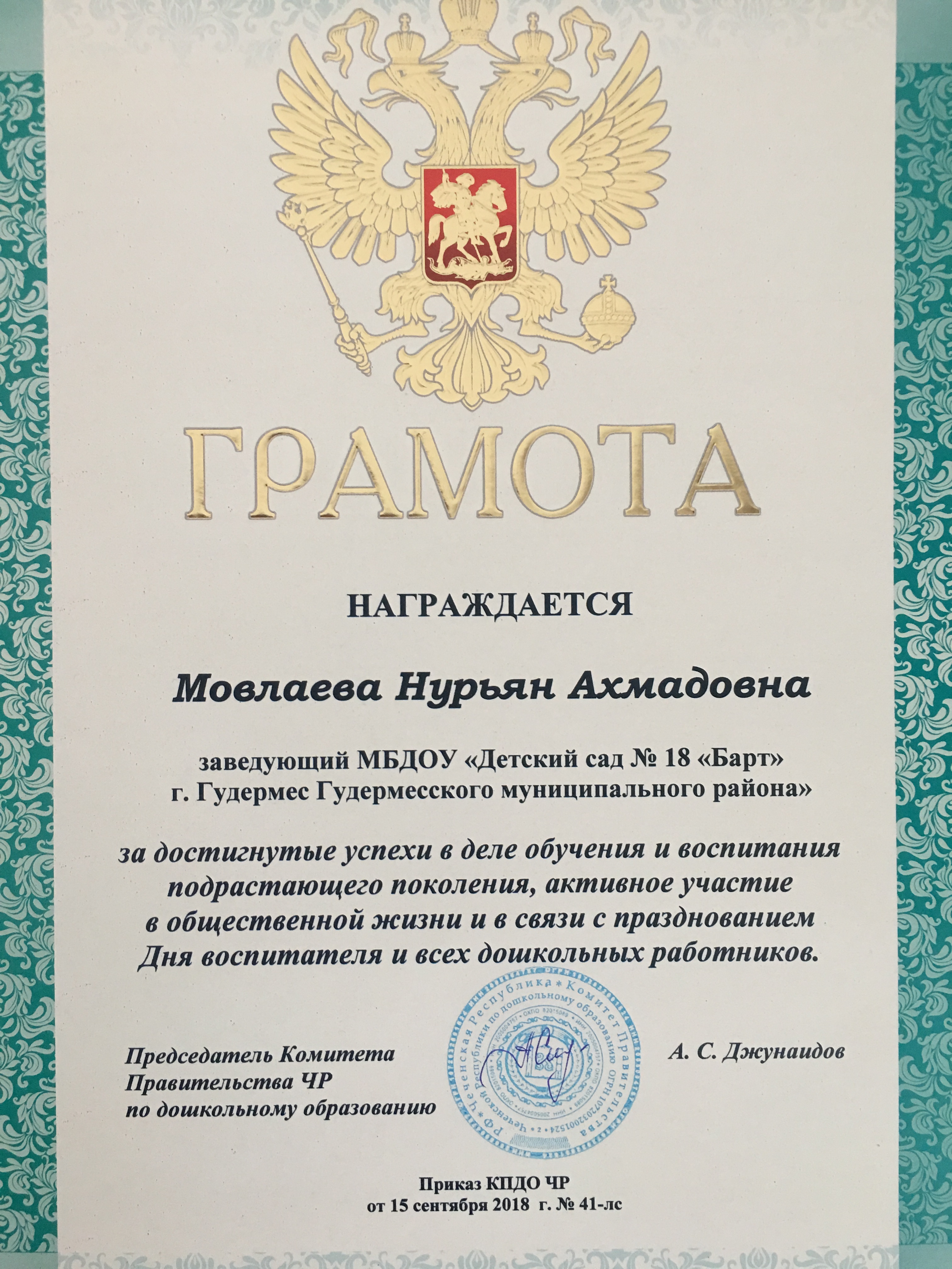 29.09.201829 сентября прошёл профсоюзный форум, на котором наш заведующий был награждён грамотой: за достигнутые успехи в деле обучения и воспитания подрастающего поколения, активное участие в общественной жизни и в связи с празднованием Дня воспитателя и всех дошкольных работников. Для нас большая честь и гордость, работать в одной команде с таким руководителем!