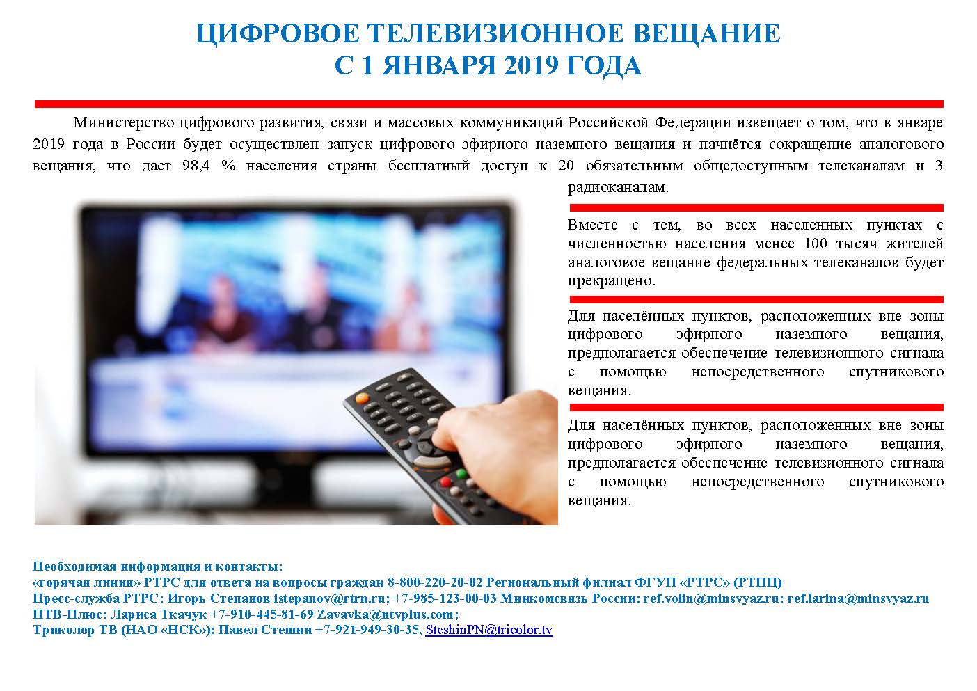 26.12.2018Министерство цифрового развития, связи и массовых коммуникаций Российской Федерации извещает о том, что в январе 2019 года в России будет осуществлен запуск цифрового эфирного наземного вещания и начнётся сокращение аналогового вещания, что даст 98,4 % населения страны бесплатный доступ к 20 обязательным общедоступным телеканалам и 3 радиоканалам.